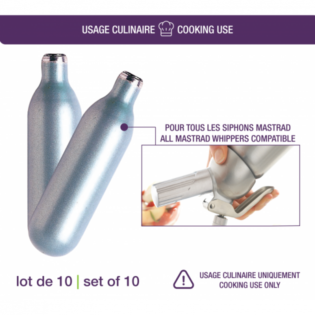 Les cartouches Mastrad sont des recharges de N20 pour Siphons Mastrad et vous permettront la réalisation de mousses chaudes ou froides