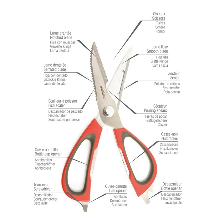 Ces ciseaux multifonctions Mastrad pourront s’utiliser comme ciseaux, comme couteaux lorsque les lames sont désolidarisées, comme casse-noix, ou encore décapsuleur et tournevis.