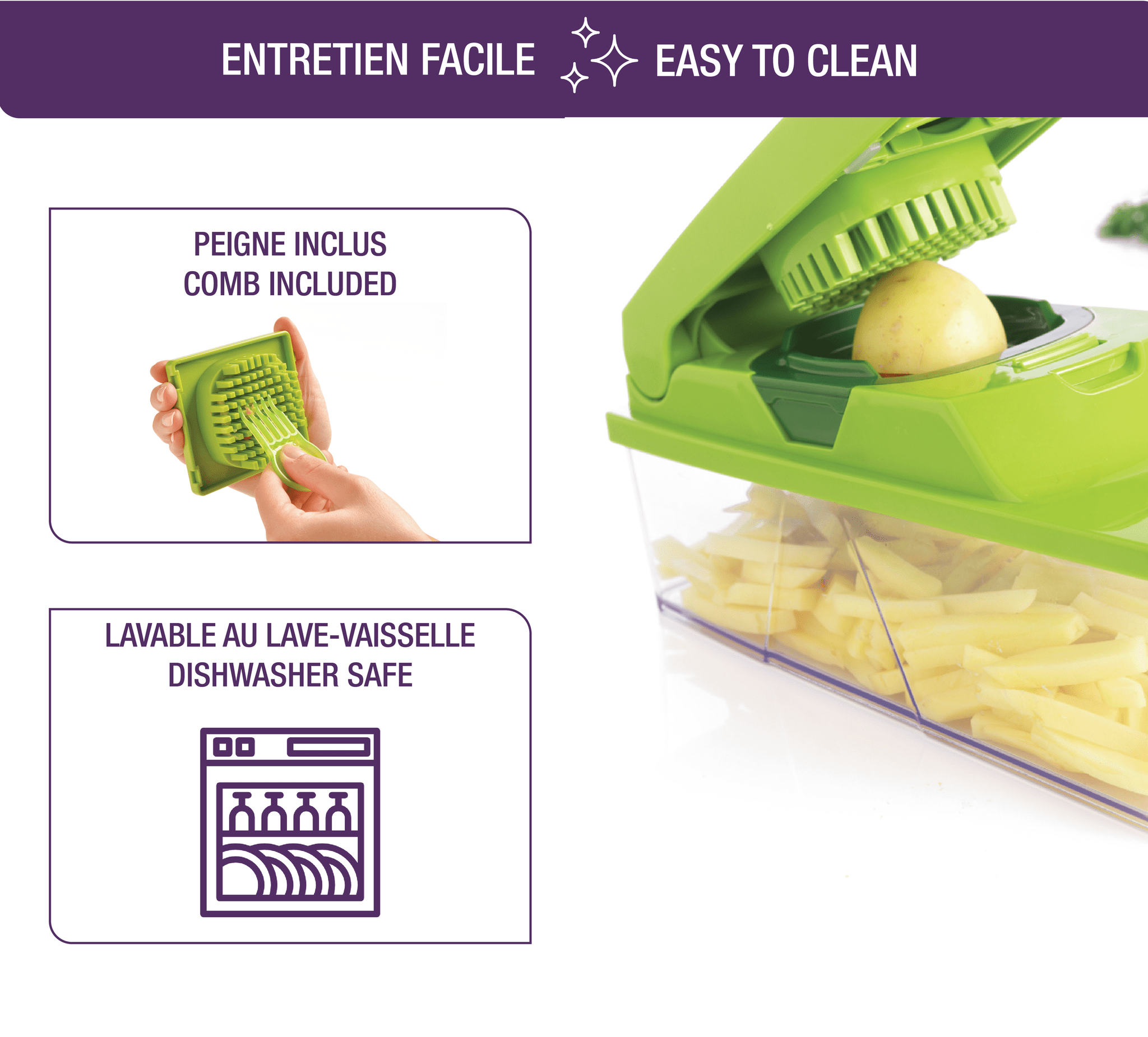 Ce coupe-légumes Mastrad possède des grilles interchangeables pour trancher, faire des bâtons ou des dés de légumes. Son réservoir pourra se transformer en boîte de conservation grâce à son couvercle.