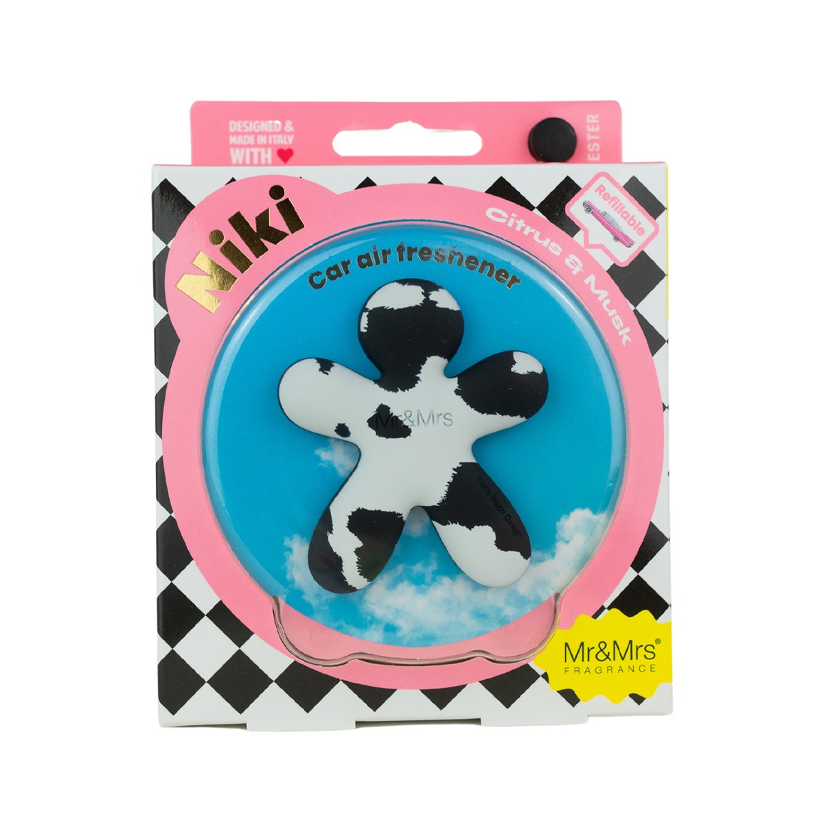 Disponible en plusieurs coloris et plusieurs senteurs, ce “petit bonhomme” Niki Citrus&Musc trouvera facilement sa place dans l’habitacle grâce à sa pince universelle.