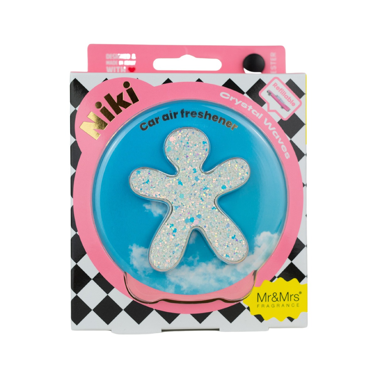 Disponible en plusieurs coloris et plusieurs senteurs, ce “petit bonhomme” Niki Crystal Waves trouvera facilement sa place dans l’habitacle grâce à sa pince universelle.
