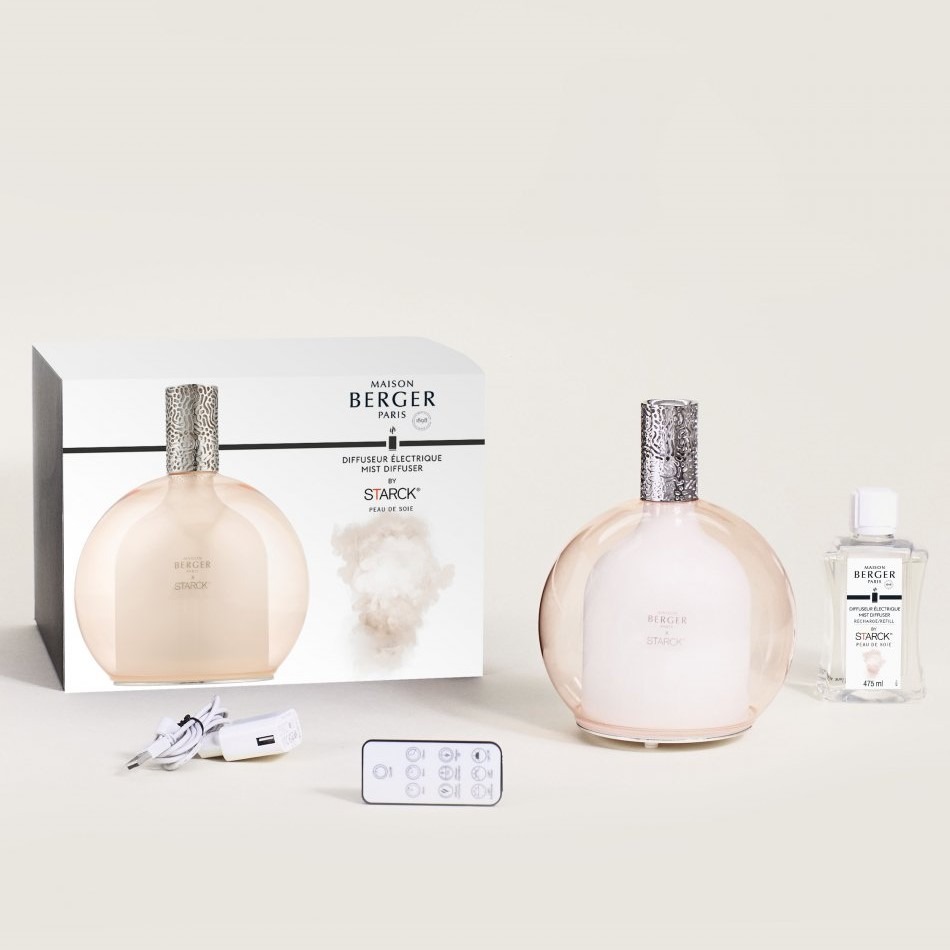 Vous trouverez dans ce coffret le nouveau diffuseur éléctrique Berger imaginé par P. Starck et décliné dans sa version “Peau de soie”.
