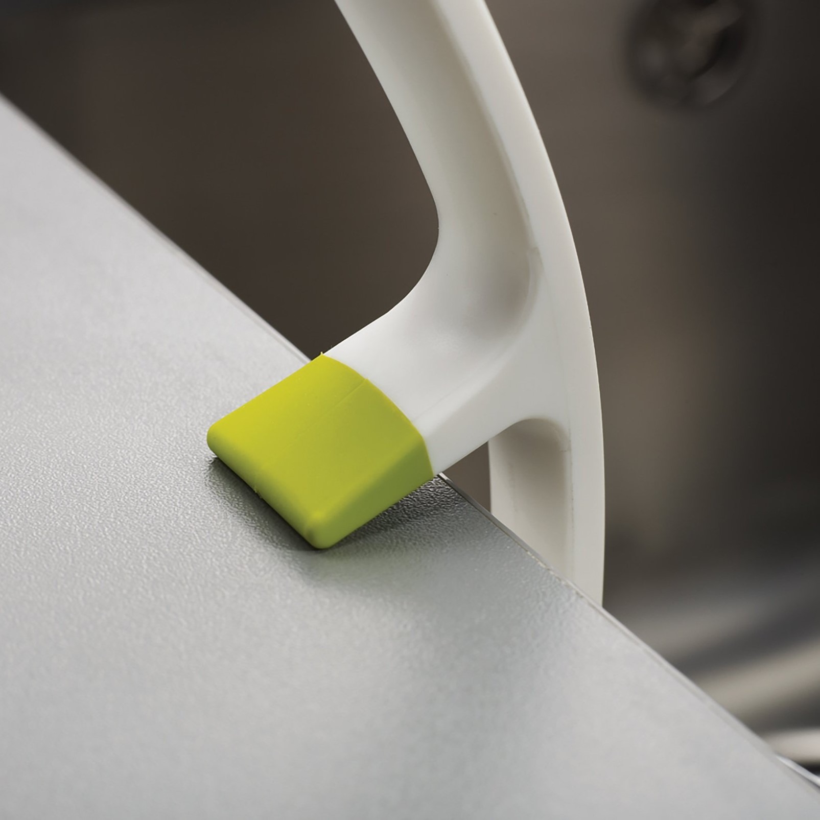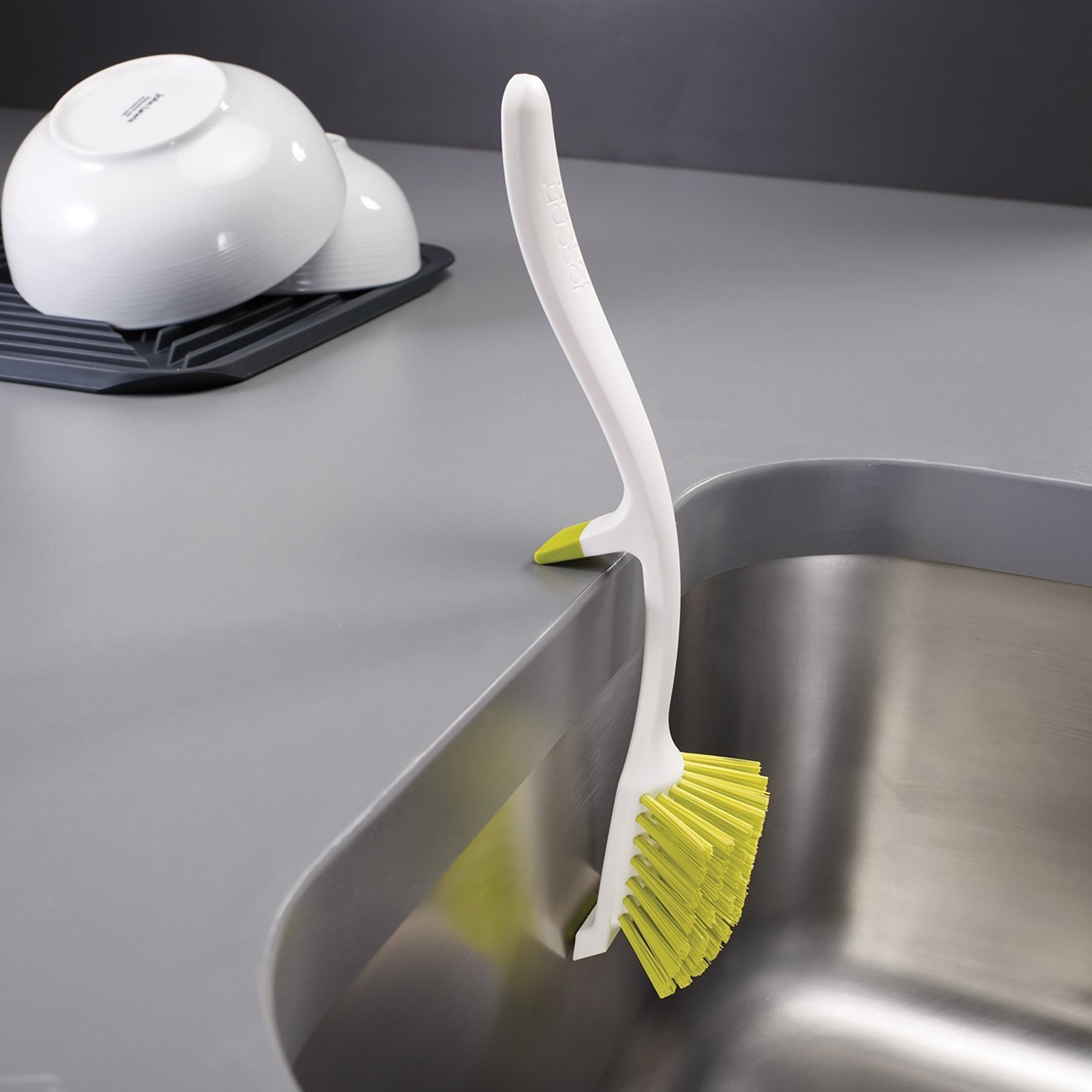 Visant un gain de place, cette brosse à vaisselle grise Joseph Joseph est conçue pour reposer sur le côté de votre évier.