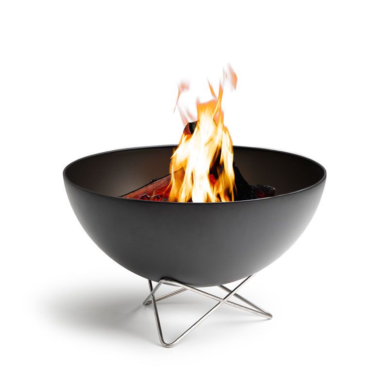 La demi-sphère en acier noir semble flotter sur le support de fil solide. Incliné, pour protéger les flammes du vent et pour diffuser efficacement la chaleur vers l’avant. Ou à l’horizontale pour faire profiter tout le monde des flammes chaleureuses du Fire Bowl.