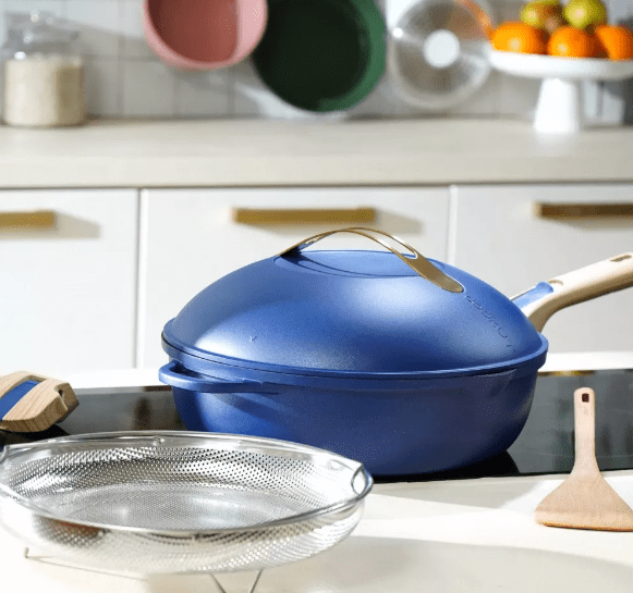 Inclus : 2 poignées détachables (une longue et une courte), un panier vapeur et une spatule en bois.