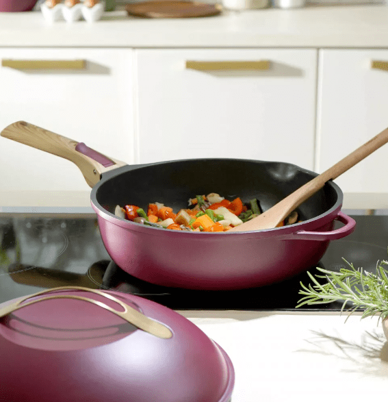 Inclus : 2 poignées détachables (une longue et une courte), un panier vapeur et une spatule en bois.