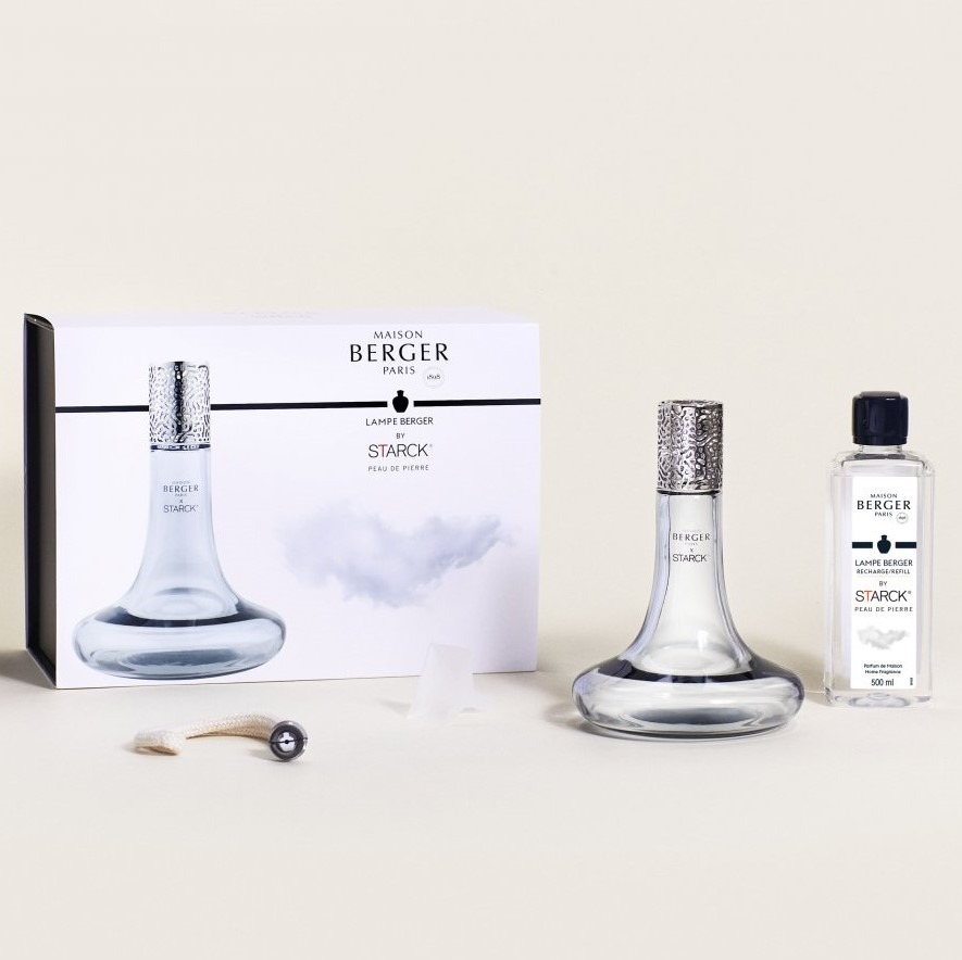Vous trouverez dans ce coffret la nouvelle Lampe Berger imaginé par P. Starck et décliné dans sa version “Peau de pierre”.