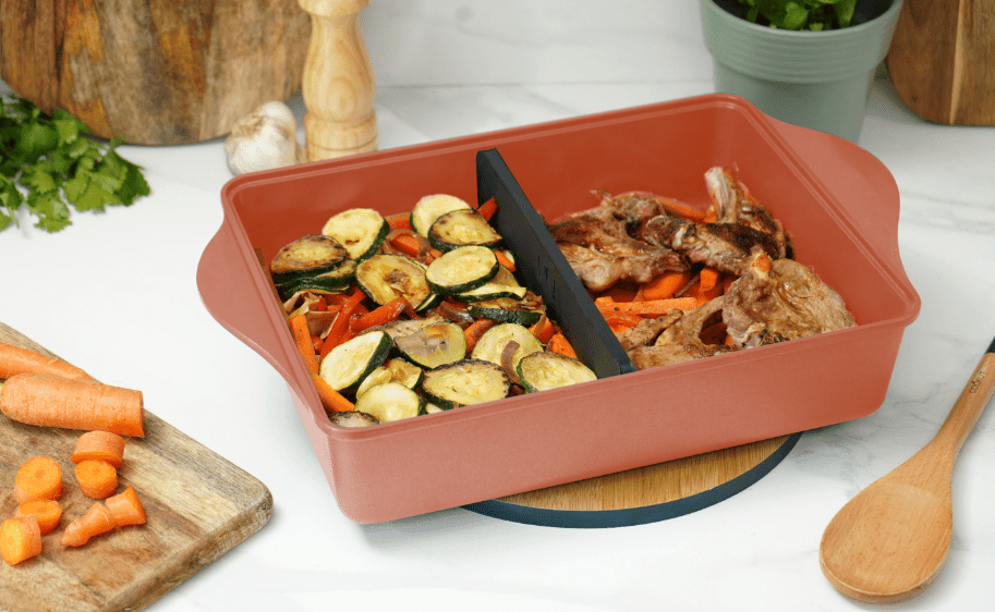 Ce plat unique remplace tous les autres plats : grâce à son séparateur breveté, ajustez facilement la taille de votre plat en fonction de vos envies et du nombre de convives.