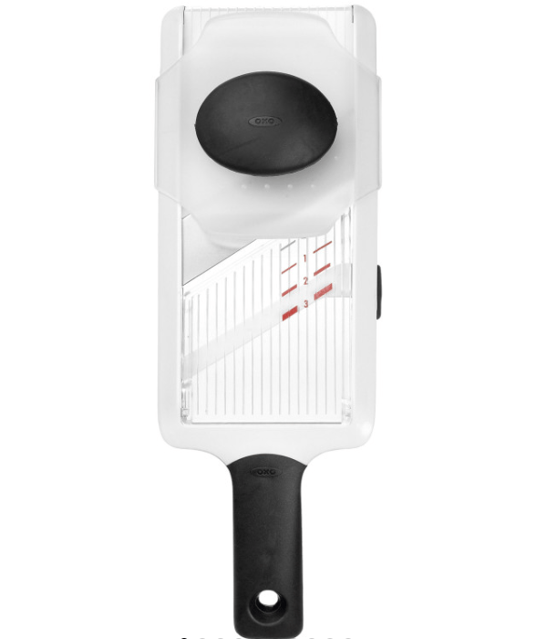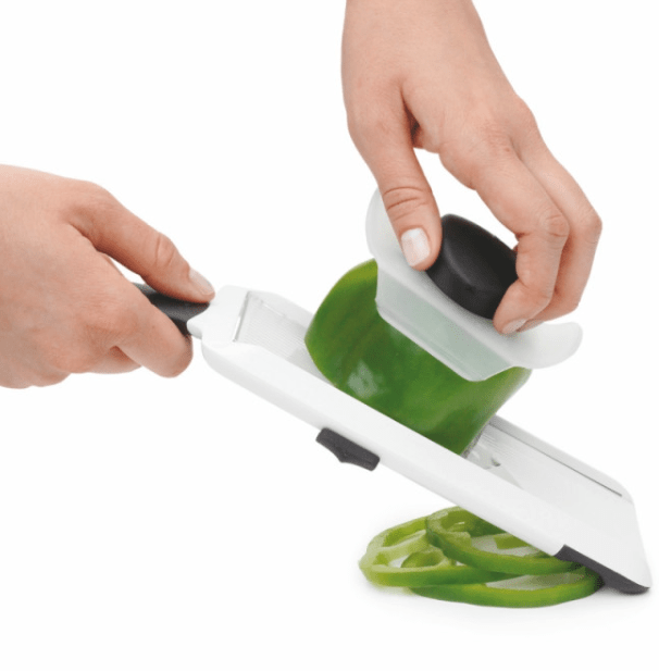 Ajoutez une dimension esthétique à vos plats avec des rondelles uniformes et régulières ! Notre mandoline à main OXO est réglable pour obtenir des lamelles de 1 à 4 millimètres. La lame en acier inoxydable offre une coupe nette et un tranchant durable, au fil des utilisations. La mandoline est dotée d’un bouton poussoir sur rail pour bien tenir le légume et éviter tout risque de coupure. Et pour éviter que votre légume ne colle et vous deviez approcher vos doigts de la lame, la surface de la mandoline est rainurée et empêche toute adhésion.