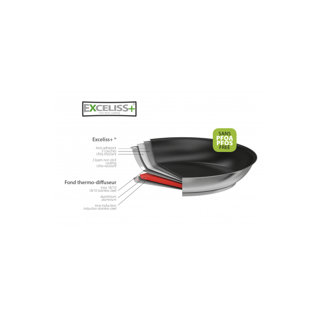 Grâce à 3 couches superposées inox 18/10, aluminium et inox, la poêle Cristel Casteline anti-adhérent Exceliss 24 est idéale pour une diffusion intégrale de la chaleur dans tout le corps de l’ustensile de cuisson. Finition brillante