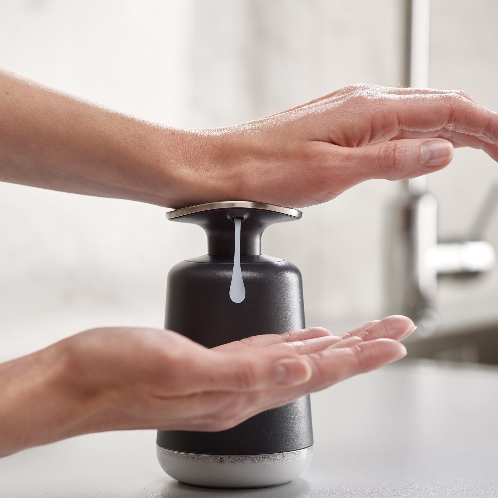 Ce distributeur de savon hygiénique Gris Joseph Joseph possède une pompe extra-large pour l’actionner facilement avec le poignet ou l’avant-bras lorsque vos mains sont sales.
