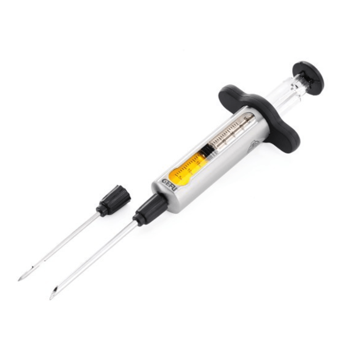 Aspirer tout simplement le liquide souhaité, introduire l’aiguille dans la viande et appuyer sur le piston.
